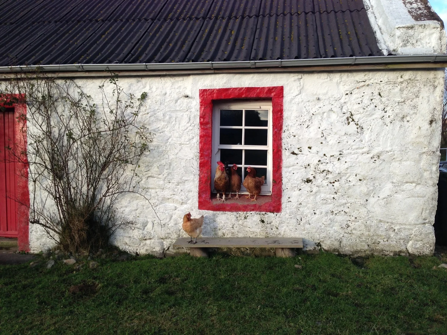 I have a seemingly willing and attentive audience for my work. The winter animal life of Knockrome - chickens, cows, sheep and Louis the cat vie for place outside the studio window while I am working. The minute I start every morning the chickens make an appearance on the window sill - the cockerels sometimes cock-a-doodle-doing so enthusiastically that I can't actually hear what I'm doing. On a good day, with the winter sun streaming in, I still have to pinch myself that I am here, finishing my music inside the old cottage.
